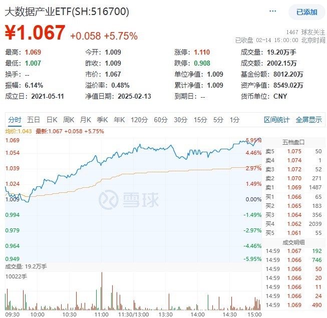 消息一出,相关板块集体狂飙,截至收盘,一站布局数据要素全产业链的大数据产业ETF(516700)场内价格收涨5.75%,聚焦信息技术应用创新赛道的信创ETF基金(562030)场内价格亦大涨4.87%。